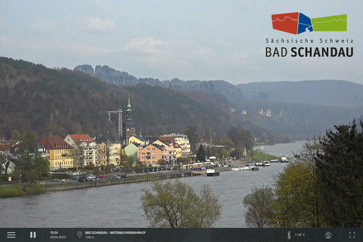 Ein traumhafter Schwenk über die Elbe, mit Blick Richtung Wehlen, dem Basteimassiv, über den Ortsteil Oberrathen hinauf elbaufwärts bis zum Lilienstein.